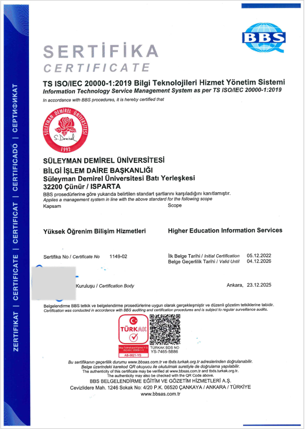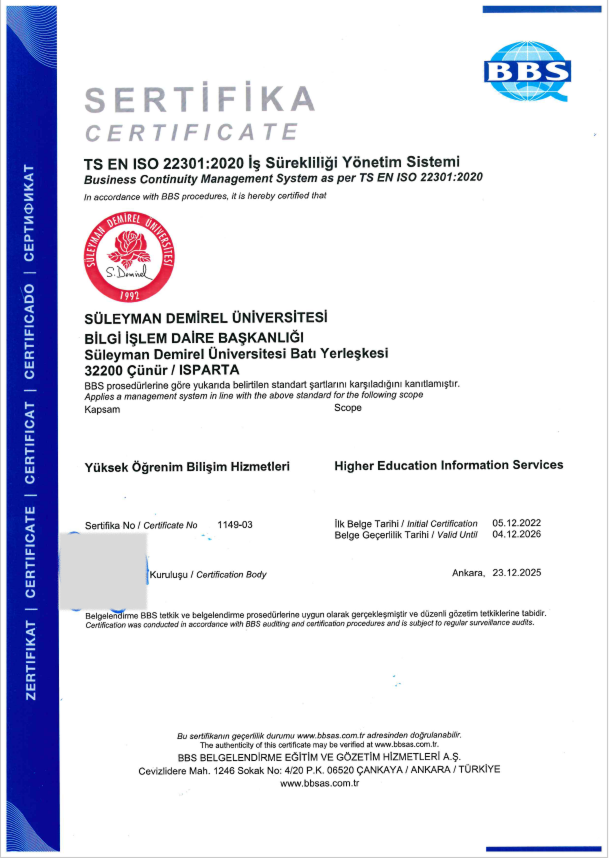 | ISO 22301 İŞ SÜREKLİLİĞİ YÖNETİM SİSTEMİ | ISO 20000-1 BİLGİ TEKNOLOJİLERİ HİZMET YÖNETİM SİSTEMİ |
